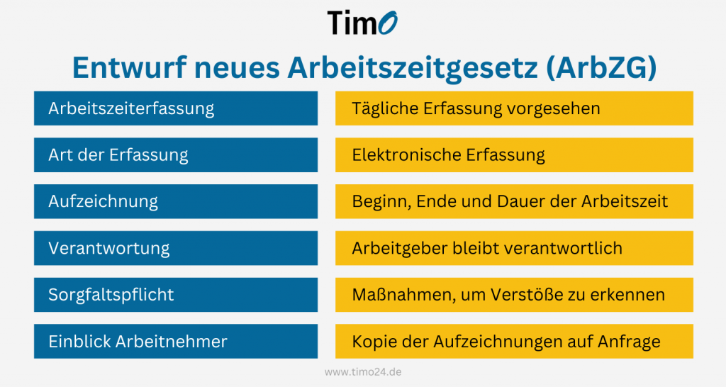 Alle Arbeitgeber sollen verpflichtet werden, die Arbeitszeiten ihrer Mitarbeiter systematisch zu erfassen. Dabei wird betont, dass Arbeitgeber verpflichtet sind, Beginn, Ende und Dauer der täglichen Arbeitszeit zu erfassen. Die Erfassung soll jeweils am Tag der Arbeitsleistung erfolgen.
