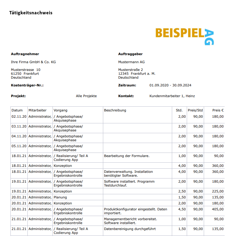 - Automatische Erstellung von Tätigkeitsnachweisen für Auftraggeber