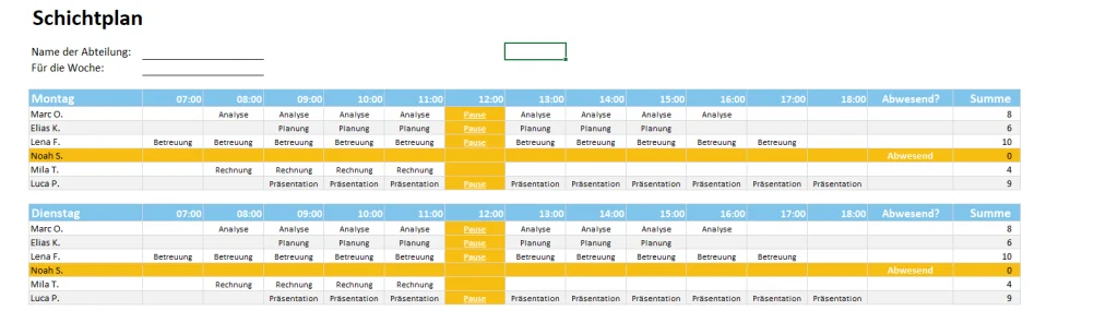 Schritt 2 – Formatierungen hinzufügen: Verwenden Sie Farben, um unterschiedliche Schichten oder Tage hervorzuheben (z. B. Blau für Frühschichten, Grün für Spätschichten). Das sorgt für eine bessere Übersicht.