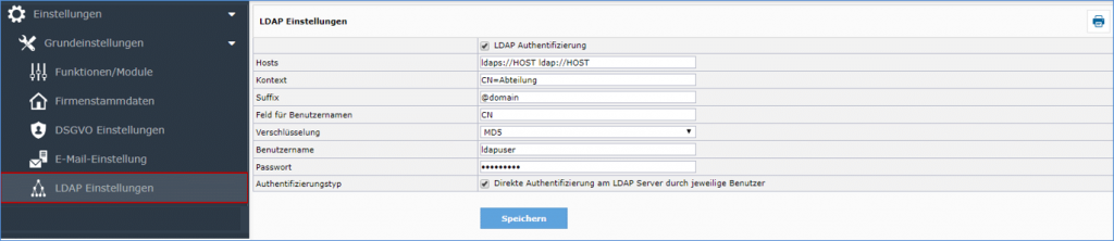 Die LDAP-Einstellungen werden vom Administrator im Reiter „Einstellungen“ unter „LDAP Einstellungen“ vorgenommen.
