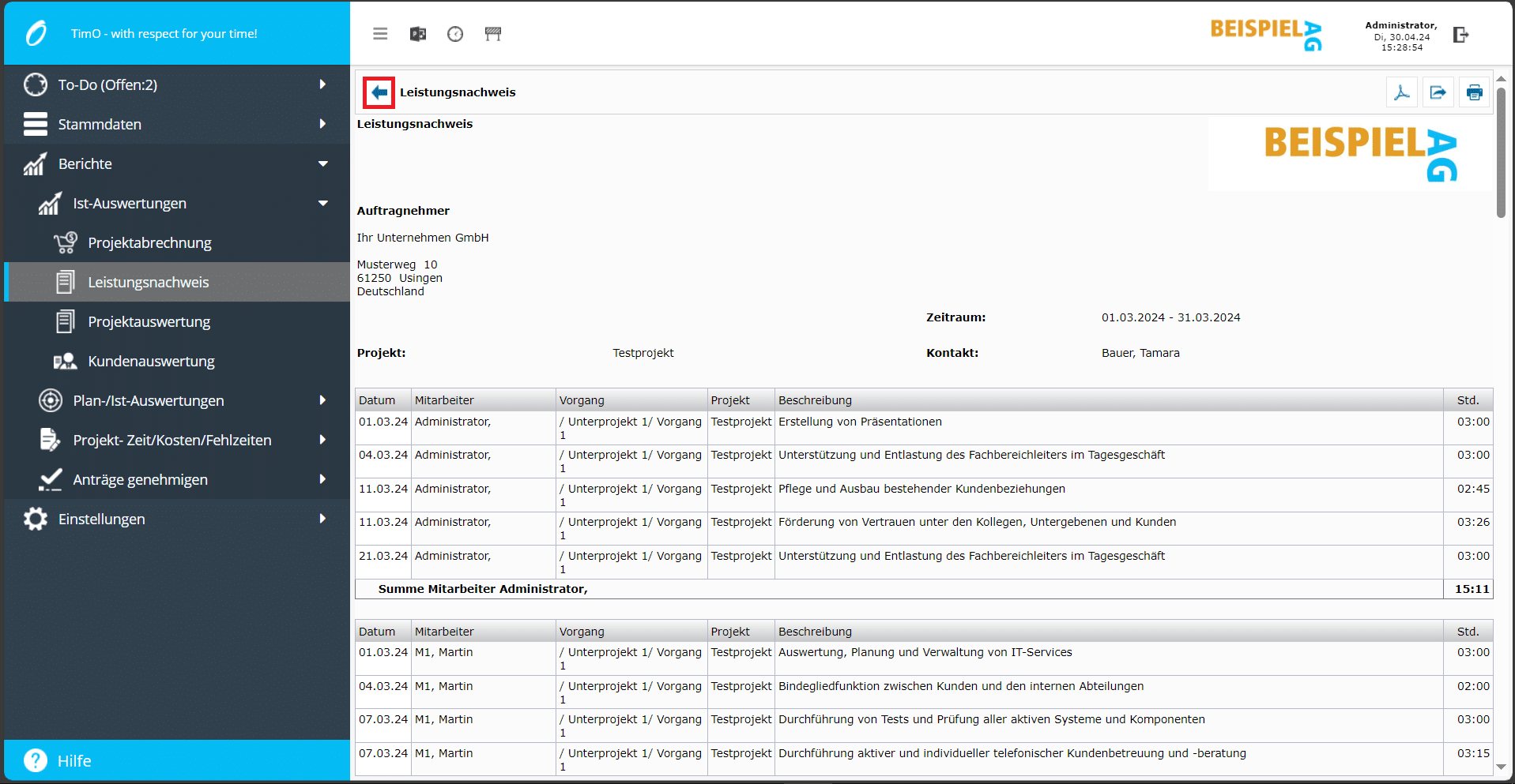 • Detaillierter Leistungsbericht (Mitarbeiter, Tätigkeiten und Stunden)