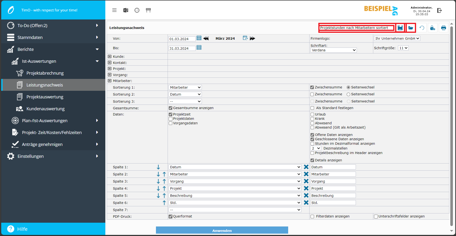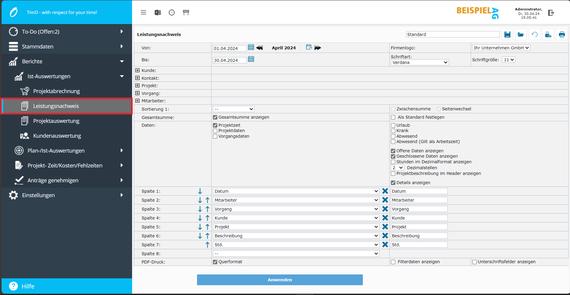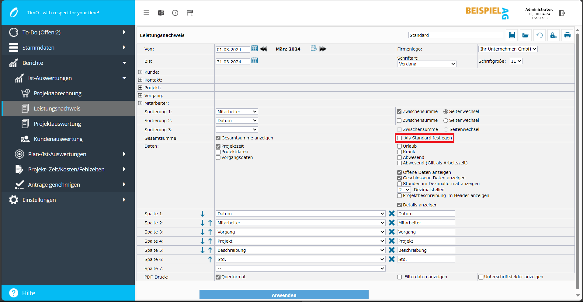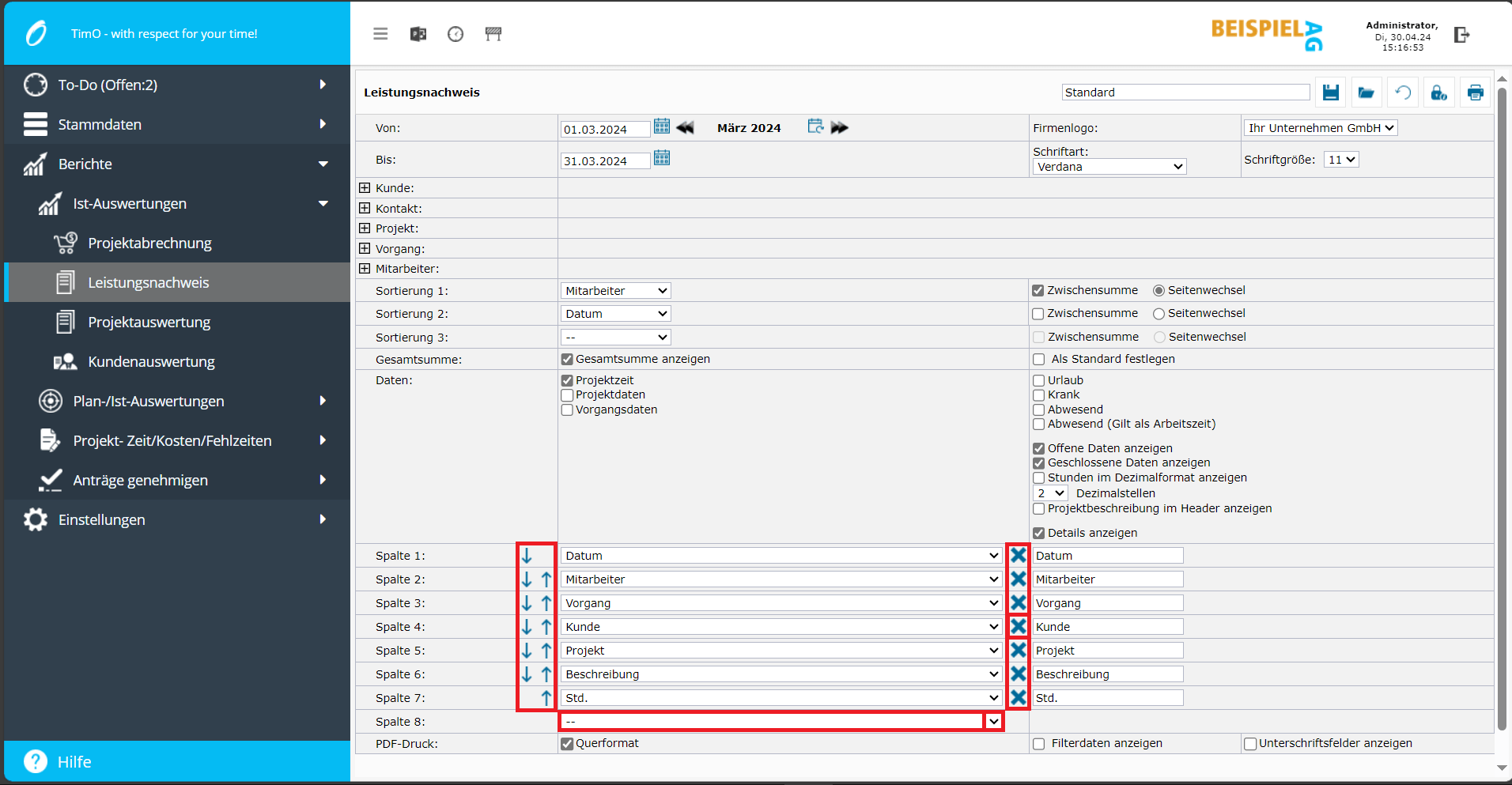 Individuellen Stundennachweis erstellen, Spalten auswählen und Reihenfolge festlegen