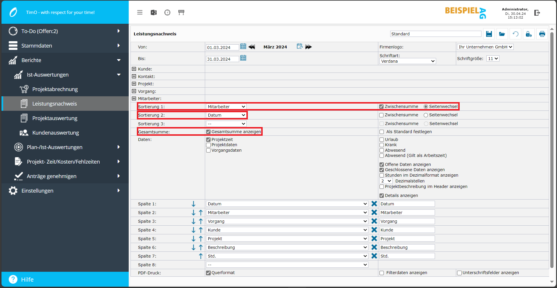 Wählen Sie die Sortierung 1 und die Sortierung 2 wie im Bild gezeigt, damit später im PDF-Report jeder Mitarbeiter auf einer neuen Seite angezeigt wird.