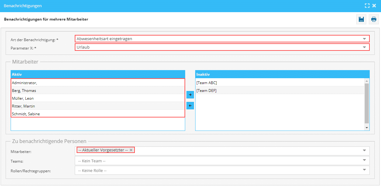Danach klicken Sie auf “Hinzufügen” und wählen bei der Benachrichtigungsart “Abwesenheitsart eingetragen” den Parameter “Urlaub”. Bestimmen Sie, dann die zu überwachenden Mitarbeiter und Teams und wählen Sie anschließend die Personen aus, die benachrichtigt werden sollen.