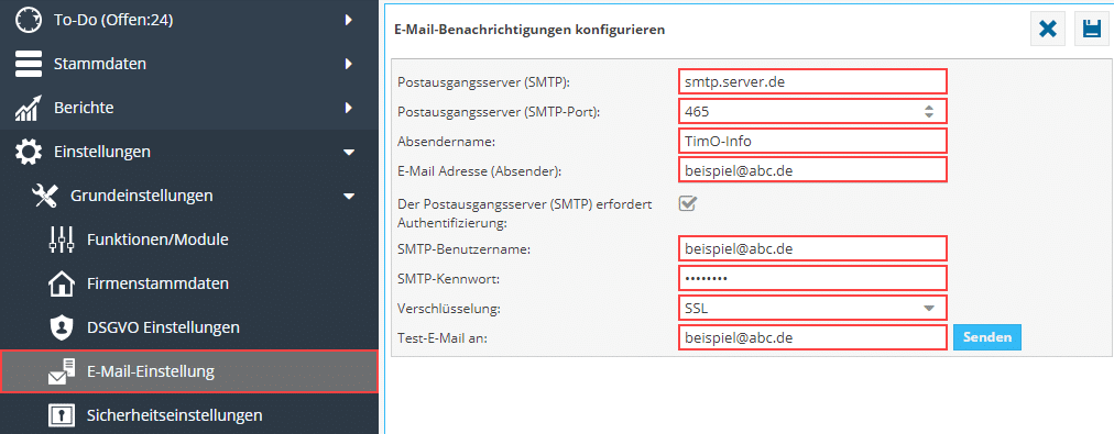 Zuerst müssen Sie als Administrator eingeloggt unter Einstellungen -> Grundeinstellungen -> E-Mail-Einstellung die richtigen Einstellungen hinterlegen. Nachdem Sie die Einstellungen eingetragen haben, können Sie die Einstellungen mit dem Klick auf die Schaltfläche “Senden” testen. Für die genauen Einstellungen können Sie Ihren internen IT-Ansprechpartner fragen.