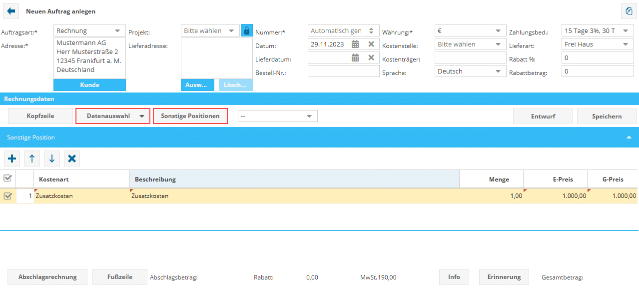 Danach wählen Sie für eine freie Position die Option “Sonstige Positionen”, um z.B. einen Festpreis abzurechnen.