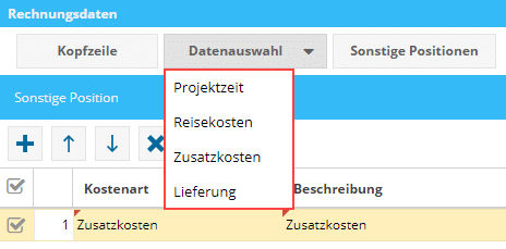 Wollen Sie lieber Projektzeiten, Zusatzkosten, Reisekosten oder Lieferungen abrechnen, wählen Sie zuerst ein Projekt aus und klicken danach auf die Option “Datenauswahl”.