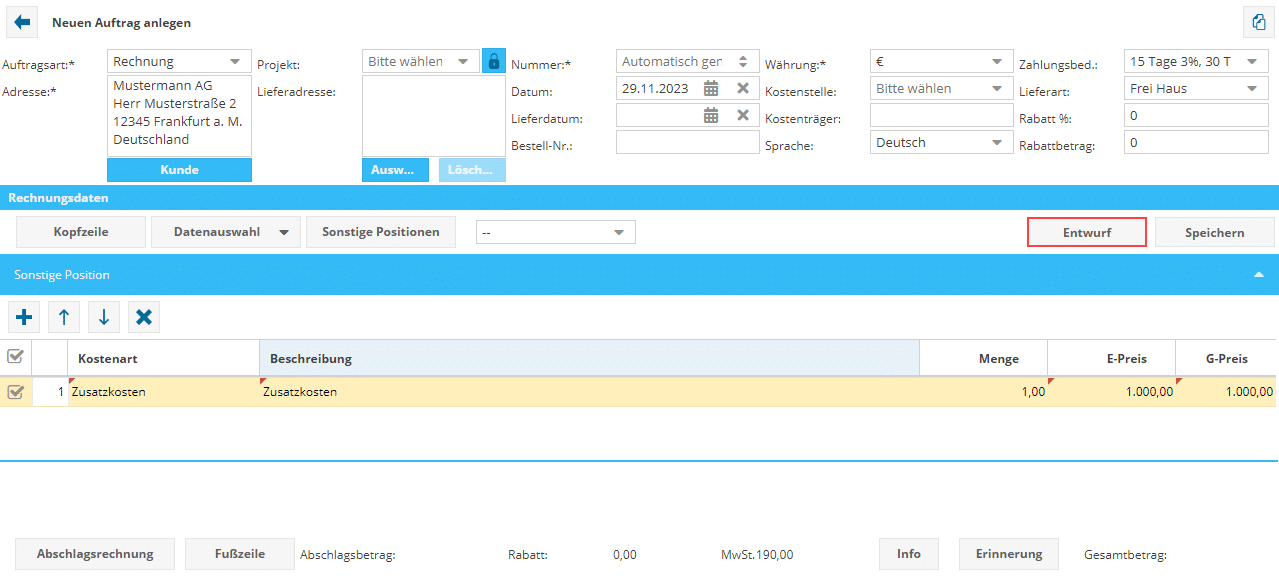 Nachdem Sie alle Daten eingetragen haben, können Sie Ihre Rechnung mit einem Klick auf Entwurf vor dem Abspeichern kontrollieren.