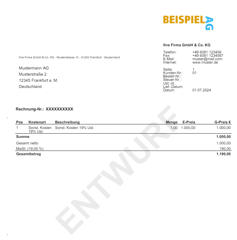 Nachdem Klick auf “Entwurf” sehen Sie eine Vorschau als PDF. Die Vorschau beinhaltet noch keine richtige Rechnungsnummer und enthält ein Wasserzeichen mit “Entwurf”.
