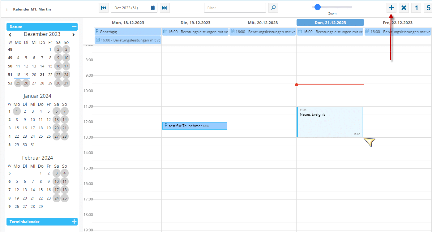 In Ihrem TimO-Kalender können Sie durch Klicken auf das ‘+’ oder durch gedrückt halten und ziehen Ihrer Maus einen neuen Termin anlegen.