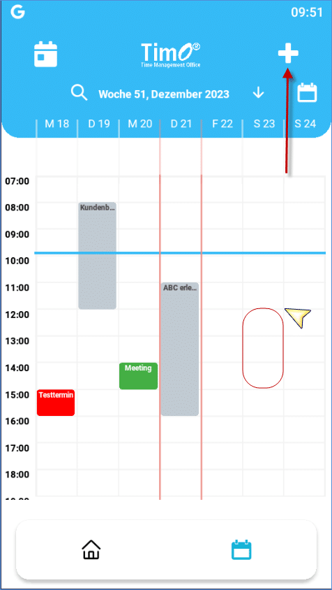 Loggen Sie sich in der TimO-Mobile-App ein. Tippen Sie auf den Kalender. Einen neuen Termin können Sie entweder über den Button ‘+’ oder durch Tippen auf eine Zeit im Zeitraster erstellen.