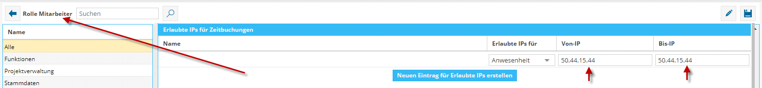 Bitte prüfen Sie, ob Sie im Rollenstamm den Block für IP-Einschränkung sehen. Wenn nicht, informieren Sie das TimO-Support-Team Ihnen im Backend-Konfigurator die IP-Sperre zu aktivieren.