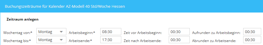 Lässt man alle Felder (außer die mit * markierten Pflichtfelder) frei, so gibt es keine Rundungen, sondern ein Stempeln zwischen offiziellem Arbeitsbeginn und offiziellem Arbeitsende ist möglich. Davor und danach erhält man eine Fehlermeldung, dass man sich außerhalb des erlaubten Buchungszeitraums befindet.