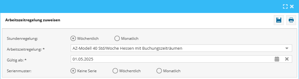 Schließlich die passende Arbeitszeitregelung auswählen und das Gültigkeitsdatum eingeben, ab wann die neue Regelung greifen soll. Am Ende das Ganze mit dem Disketten-Symbol rechts oben abspeichern: