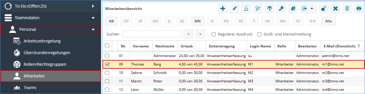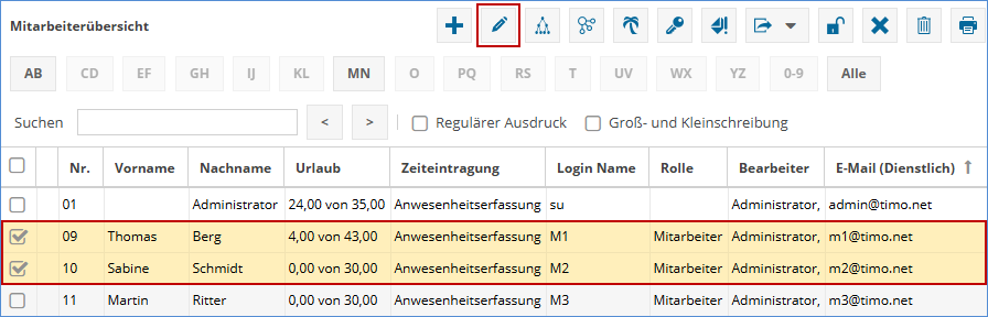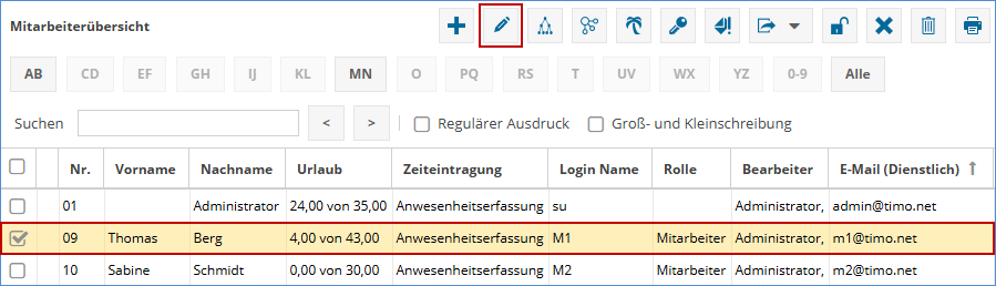 Nach der Auswahl des Mitarbeiters klicken Sie auf die Schaltfläche “Bearbeiten“ oder führen einen Doppelklick auf die ausgewählte Person aus.