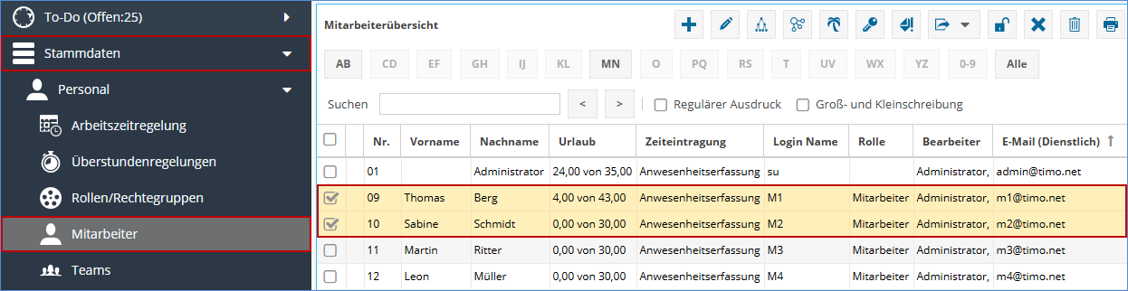 Falls Sie die Projektzeiterfassungsart für mehrere Personen gleichzeitig umstellen möchten, begeben Sie sich erneut zu den Stammdaten unter Stammdaten -> Personal -> Mitarbeiter und wählen die entsprechenden Mitarbeiter aus.