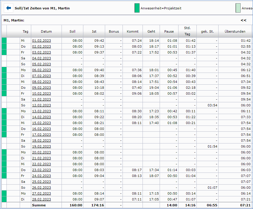 Wählen Sie das Menü “Berichte -> Anwesenheitsverwaltung -> Personal Soll/Ist”, dort sehen Sie Ihren Überstundenstand, die von Ihnen zu leistenden Soll-Stunden und zum Vergleich die von Ihnen erbrachten Ist-Stunden.