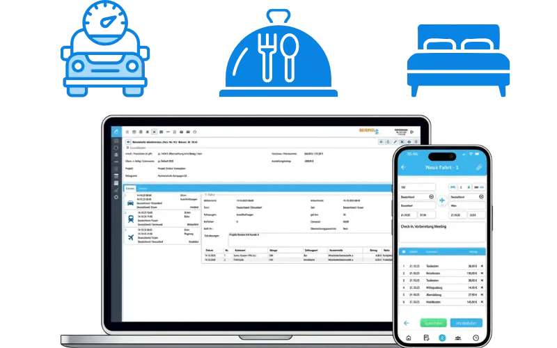 Die Software berechnet automatisch gesetzliche Pauschalen und ermöglicht eine Zuordnung zu Projekten, Kunden oder Kostenstellen. Dadurch werden Reisekosten direkt im Projektcontrolling sichtbar und können in Auswertungen oder Abrechnungen übernommen werden.