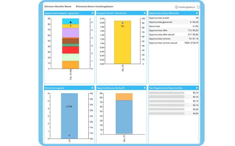 Durch die intuitive Drag-&-Drop-Bedienung können Opportunities schnell aktualisiert und priorisiert werden. Das erleichtert die tägliche Vertriebsarbeit, verbessert die Transparenz und unterstützt eine gezielte Salespipeline-Optimierung.
