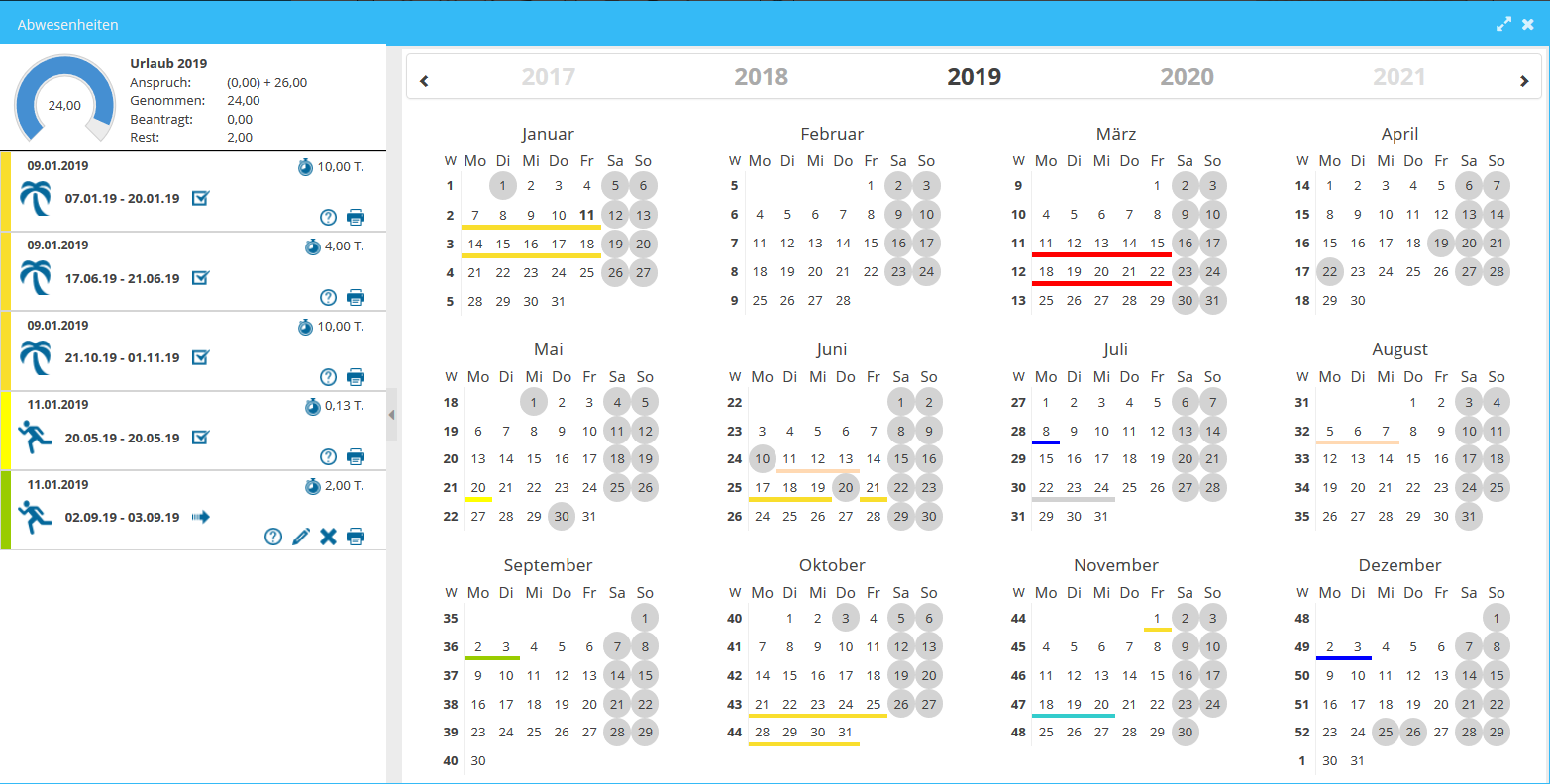 Jeder Beschäftigte wird aktiv in den Online-Urlaubsplaner eingebunden. Er kann seinen Urlaubsanspruch einsehen, Abwesenheiten eintragen und Übersichten ausdrucken. Das spart Zeit und unnötige Nachfragen. In der Monats- und Jahresübersicht sehen sie alle Resturlaubstage und genehmigte Anträge. Mit der praktischen digitalen Lösch-Funktion lassen sich einfach Änderungen umsetzen: Tag auswählen, Lösch-Anfrage senden und voilá schon kann der Arbeitgeber das digitale Dokument genehmigen. Praktisch! Der Urlaubsanspruch reduziert sich dann automatisch!
